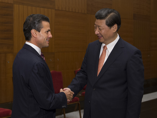 习近平表示,今年6月,我对墨西哥进行了成功的国事访问。3个月来,我们达成的各项共识正在得到积极落实并取得显著进展。中墨关系进入全新发展阶段。双方应该扎实推进各领域合作,不断充实中墨全面战略伙伴关系,特别是要扩大双向投资和经贸合作,加大基础设施建设等领域合作。双方政府部门要为两国企业投资合作和相互市场准入创造有利条件。希望双方就设立中墨投资基金抓紧磋商。中方愿同墨方共同努力,推动尽早建立中拉合作论坛,积极推进中拉全面合作伙伴关系。 >>>详细内容