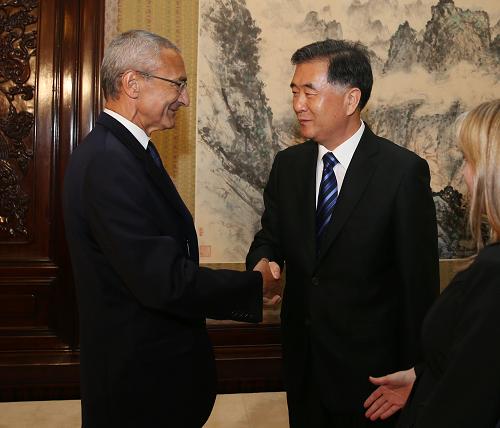 9月11日,中国国务院副总理汪洋在北京中南海紫光阁会见美国进步中心主席、前白宫办公厅主任波德斯塔和美国前总统国家安全事务助理伯杰一行。这是汪洋与波德斯塔握手。新华社记者 刘卫兵 摄