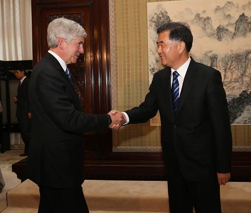9月11日,中国国务院副总理汪洋在北京中南海紫光阁会见美国密歇根州州长斯奈德一行。新华社记者 刘卫兵 摄
