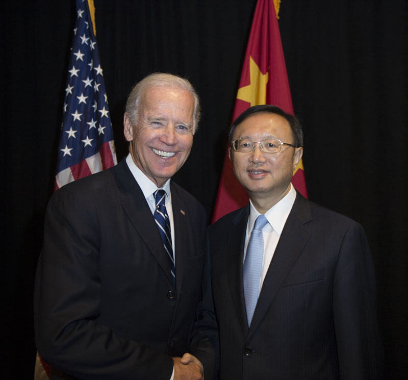 当地时间9月16日下午,中国国家主席习近平特别代表、国务委员杨洁篪(右)在美国洛杉矶会见美国副总统拜登。新华社记者 杨磊 摄