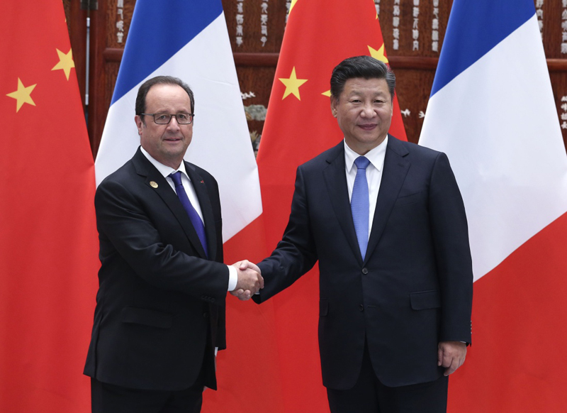 习近平指出,二十国集团领导人杭州峰会取得丰硕成果。中方高度赞赏法方为此给予的支持。近年来,中法关系质量和水平得到全面提高,为两国人民带来更多实惠。无论国际风云如何变幻,中方始终视法国为重要战略合作伙伴,始终从战略高度和长远角度看待中法关系。中方愿同法方一道,深化各领域务实合作,密切人文交流,加强在国际事务中的沟通和协调,推动两国关系更好更快发展。