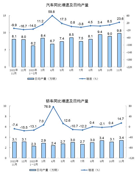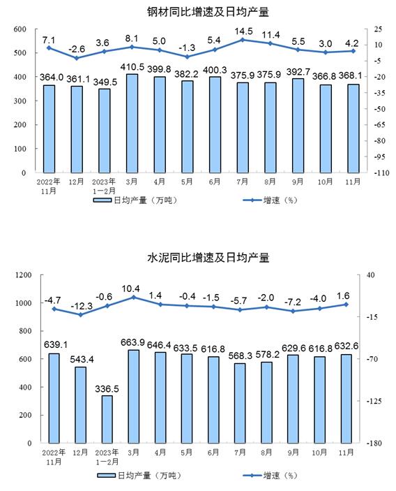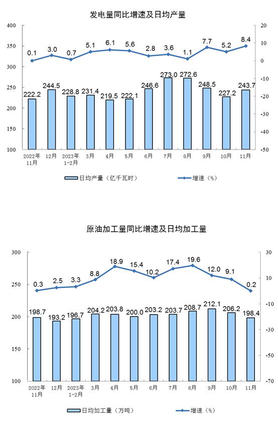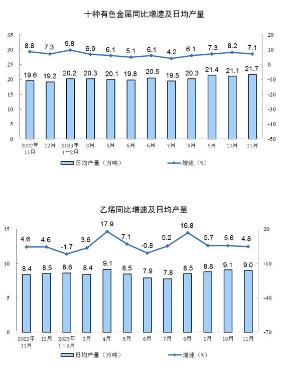分产品看,11月份,620种产品中有367种产品产量同比增长。其中,钢材11044万吨,同比增长4.2%;水泥18979万吨,增长1.6%;十种有色金属650万吨,增长7.1%;乙烯269万吨,增长4.8%;汽车295.3万辆,增长23.6%,其中新能源汽车100.6万辆,增长35.6%;发电量7310亿千瓦时,增长8.4%;原油加工量5953万吨,增长0.2%。
