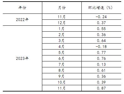 根据季节调整模型自动修正结果,对2022年11月至2023年10月份规模以上工业增加值环比增速进行修订。修订结果及2023年11月份环比数据如下: