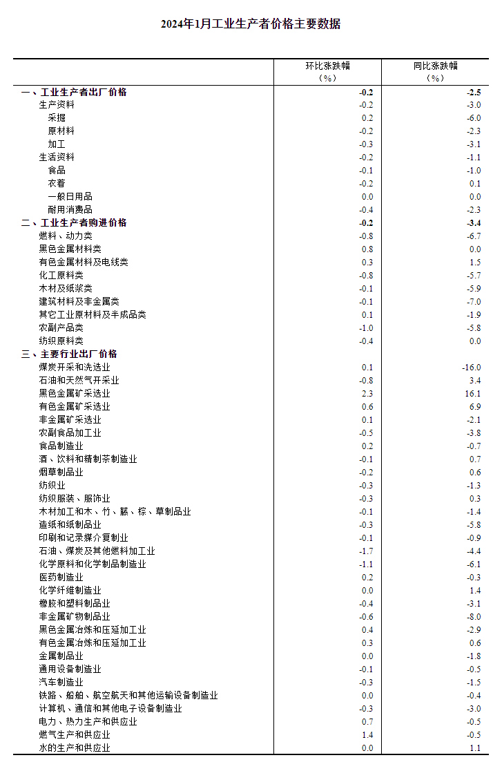 2024年1月份,受国际大宗商品价格波动影响,全国工业生产者出厂价格同比下降2.5%,环比下降0.2%,降幅比上月分别收窄0.2和0.1个百分点;工业生产者购进价格同比下降3.4%,降幅收窄0.4个百分点,环比下降0.2%,降幅与上月相同。
