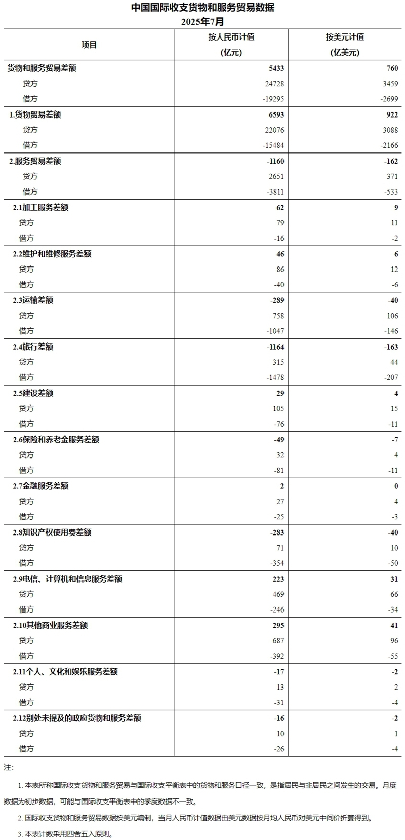 国家外汇管理局公布2025年7月我国国际收支货物和服务贸易数据