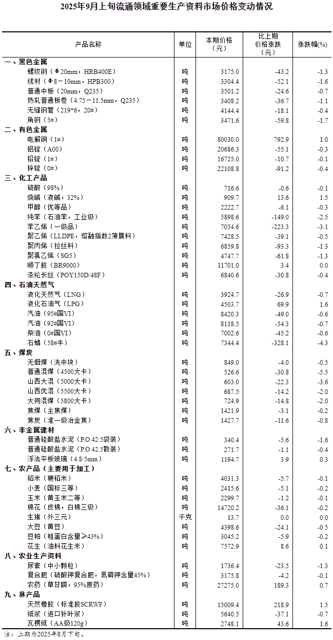 2025年9月上旬流通领域重要生产资料市场价格变动情况