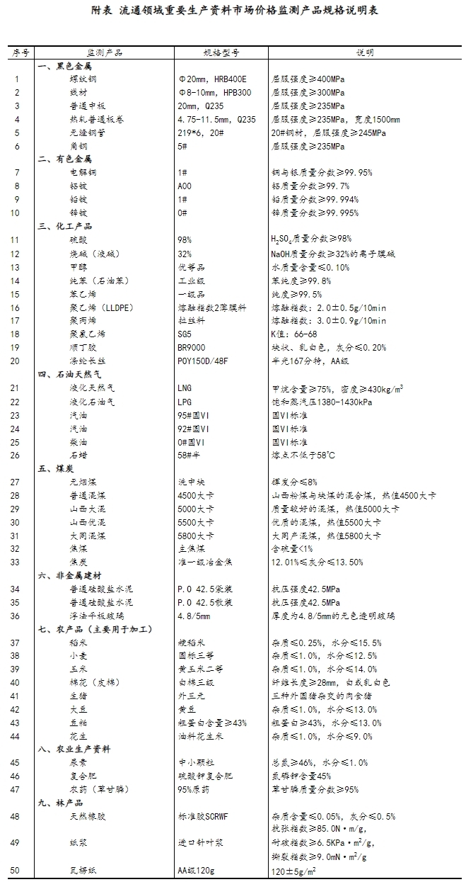 流通领域重要生产资料市场价格监测内容包括9大类50种产品的价格。类别与产品规格说明详见附表。