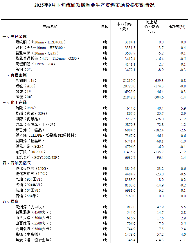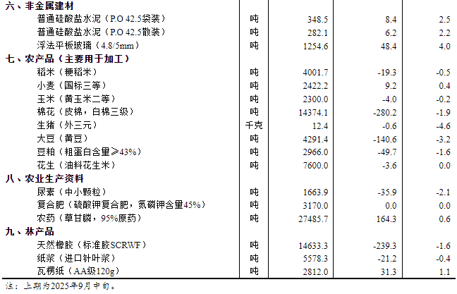 2025年9月下旬流通领域重要生产资料市场价格变动情况