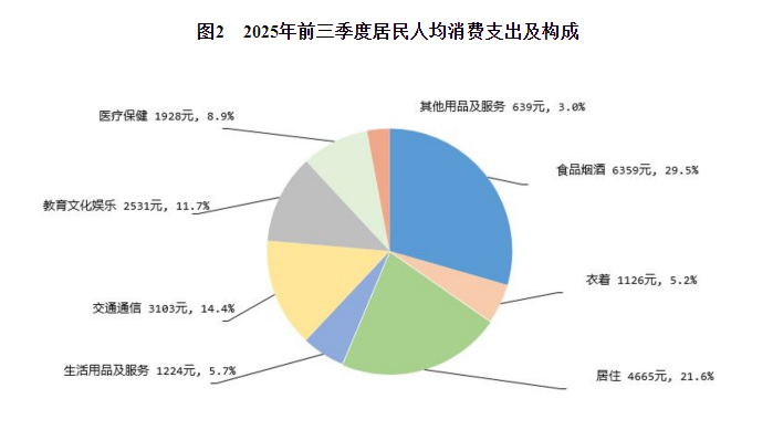 前三季度,全国居民人均食品烟酒消费支出6359元,增长2.5%,占人均消费支出的比重为29.5%;人均衣着消费支出1126元,增长1.6%,占人均消费支出的比重为5.2%;人均居住消费支出4665元,增长2.3%,占人均消费支出的比重为21.6%;人均生活用品及服务消费支出1224元,增长9.6%,占人均消费支出的比重为5.7%;人均交通通信消费支出3103元,增长8.3%,占人均消费支出的比重为14.4%;人均教育文化娱乐消费支出2531元,增长10.3%,占人均消费支出的比重为11.7%;人均医疗保健消费支出1928元,增长1.5%,占人均消费支出的比重为8.9%;人均其他用品及服务消费支出639元,增长10.3%,占人均消费支出的比重为3.0%。