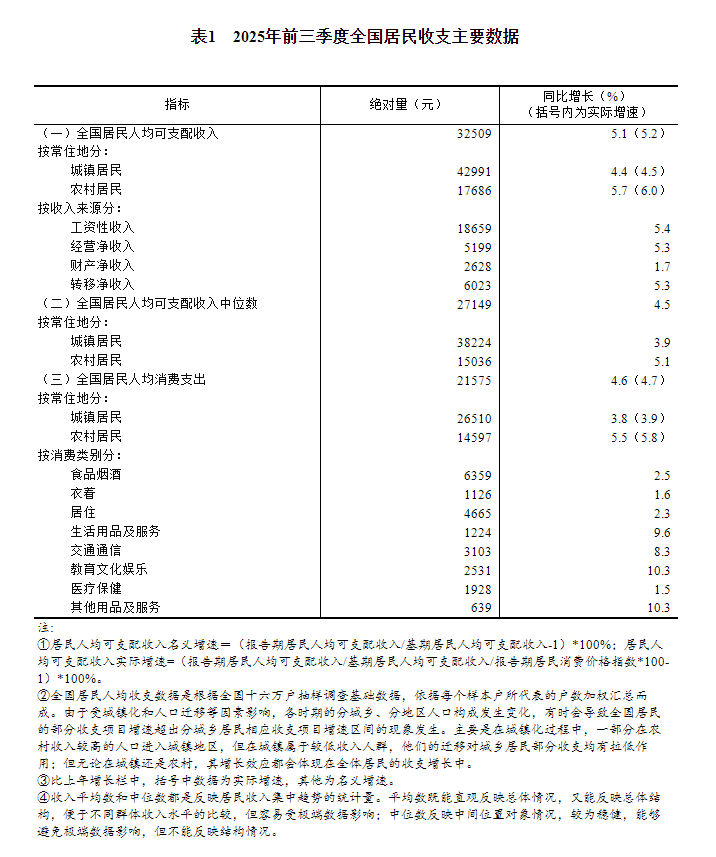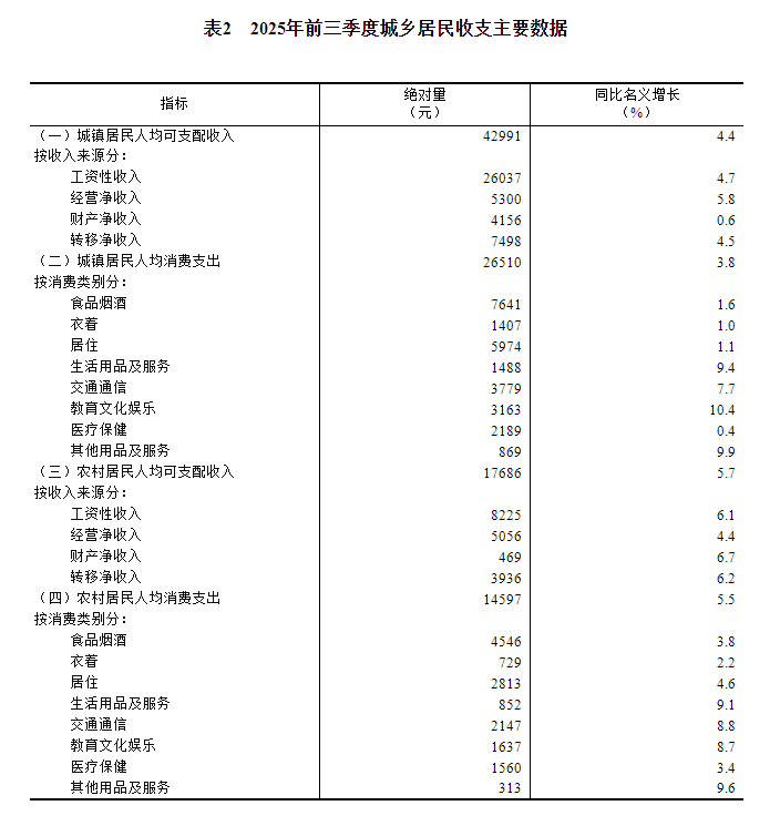 前三季度,全国居民人均可支配收入32509元,比上年同期名义增长5.1%,扣除价格因素,实际增长5.2%。分城乡看,城镇居民人均可支配收入42991元,增长(以下如无特别说明,均为同比名义增长)4.4%,扣除价格因素,实际增长4.5%;农村居民人均可支配收入17686元,增长5.7%,扣除价格因素,实际增长6.0%。