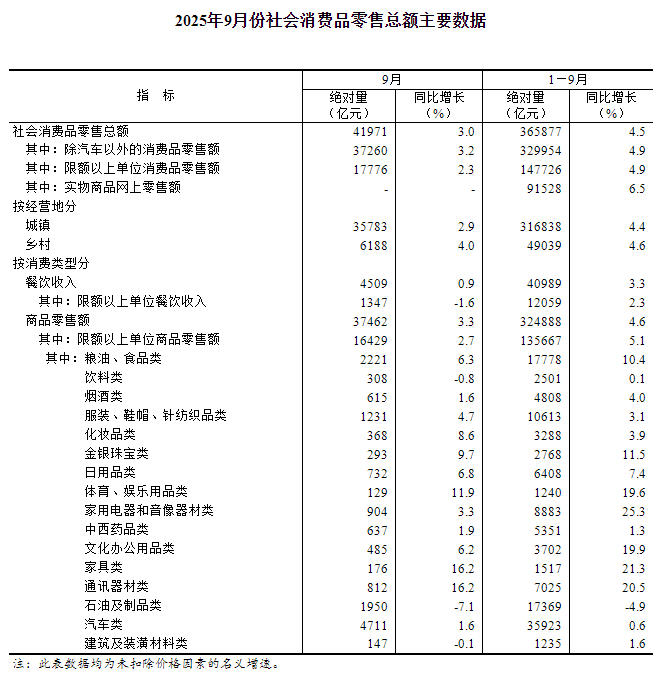 9月份,社会消费品零售总额41971亿元,同比增长3.0%。其中,除汽车以外的消费品零售额37260亿元,增长3.2%。1—9月份,社会消费品零售总额365877亿元,增长4.5%。其中,除汽车以外的消费品零售额329954亿元,增长4.9%。