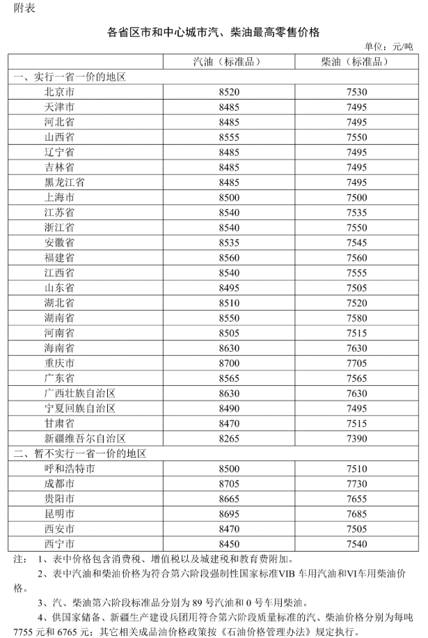 近期国际市场油价波动运行,根据10月27日的前10个工作日平均价格与上次调价前10个工作日平均价格对比情况,按照现行成品油价格机制,自10月27日24时起,国内汽、柴油价格(标准品,下同)每吨分别降低265元和255元。调整后,各省(区、市)和中心城市汽、柴油最高零售价格见附表。