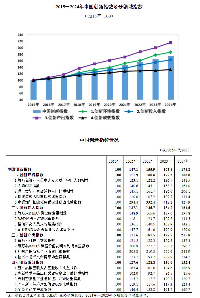 根据国家统计局社科文司《中国创新指数研究》课题组测算,2024年中国创新指数为174.2(以2015年为100),比上年增长5.3%[1]。分领域看,创新环境指数、创新投入指数、创新产出指数和创新成效指数分别为186.0、162.6、215.8和132.4,分别比上年增长4.9%、5.1%、8.1%和1.9%。结果表明,2024年中国创新指数保持稳步增长,我国科技创新能力持续提升,创新产出较快增长,发展新动能不断壮大,为经济高质量发展提供有力支撑。