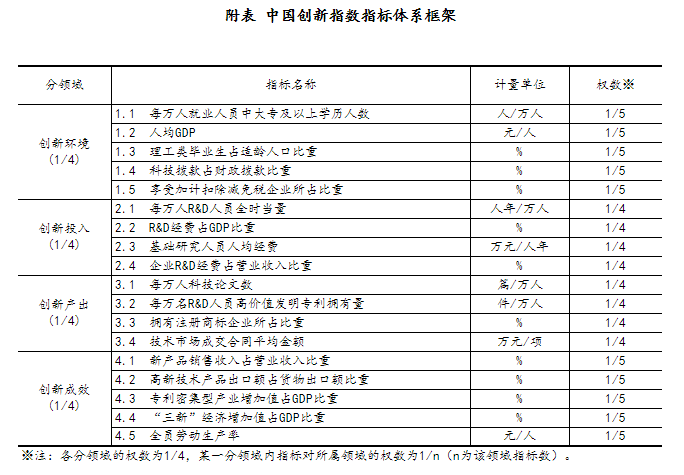 中国创新指数指标体系分成三个层次。第一个层次为我国创新总体发展情况,通过计算创新总指数反映;第二个层次为我国在创新环境、创新投入、创新产出和创新成效等4个分领域的发展情况,通过计算分领域指数反映;第三个层次为创新能力具体各方面的发展情况,通过上述4个分领域所选取的18个指标指数反映(指标体系框架详见附表)。简要说明如下: