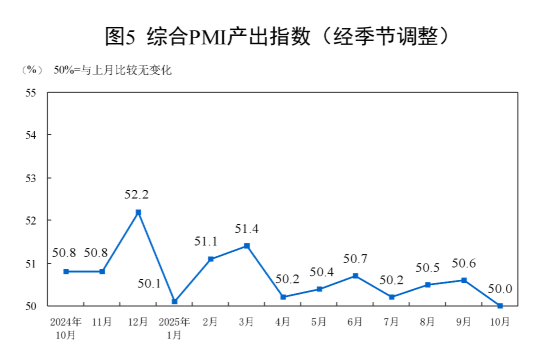 10月份,综合PMI产出指数为50.0%,比上月下降0.6个百分点,位于临界点,表明我国企业生产经营活动总体稳定。