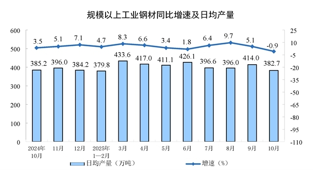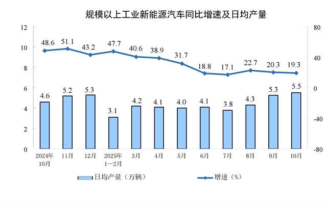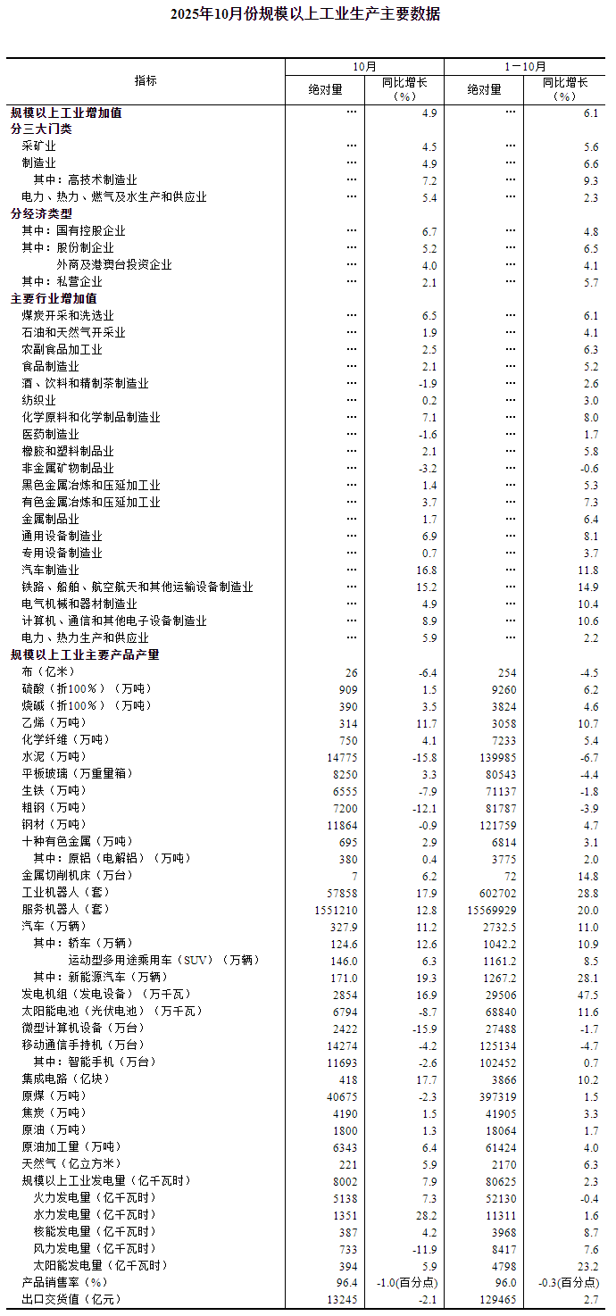 分产品看,10月份,规模以上工业623种产品中有313种产品产量同比增长。其中,钢材11864万吨,同比下降0.9%;水泥14775万吨,下降15.8%;十种有色金属695万吨,增长2.9%;乙烯314万吨,增长11.7%;汽车327.9万辆,增长11.2%,其中新能源汽车171.0万辆,增长19.3%;发电量8002亿千瓦时,增长7.9%;原油加工量6343万吨,增长6.4%。