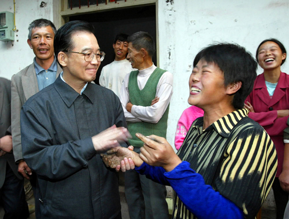 2003年10月24日,温家宝总理看望重庆市云阳县人和镇龙泉村十组的乡亲们。温家宝总理亲切地拉住熊德明的手。熊德明向总理反映,她爱人有2000多元工资被包工头拖欠,影响娃儿们交学费。总理当即表态:一会儿到县城为她讨工钱。