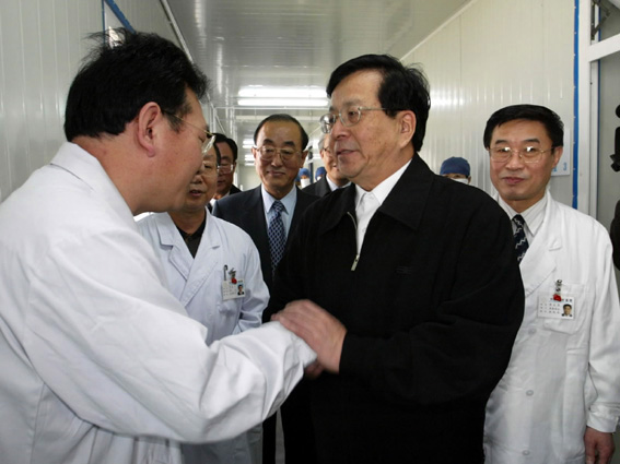2003年4月30日,中共中央政治局常委、书记处书记、国家副主席曾庆红考察了北京中日友好医院与和平家园社区,看望了参加非典型肺炎防治工作的医护人员和居民群众。这是曾庆红在北京中日友好医院与医务人员亲切握手。