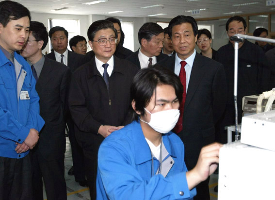 2003年5月2日,中共中央政治局常委、国务院副总理黄菊在北京考察北京航天长峰股份有限公司医疗器械分公司了解呼吸机生产情况。