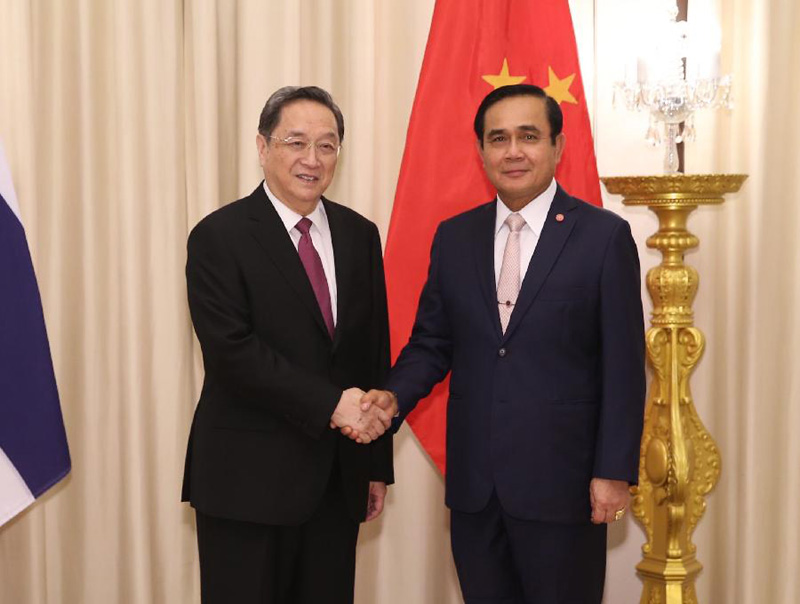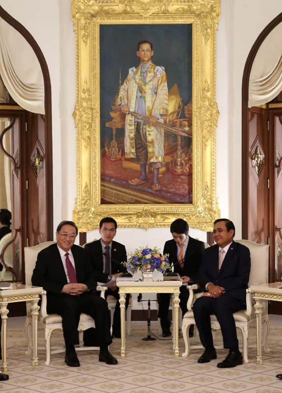 应泰国立法议会主席蓬贝邀请,全国政协主席俞正声7月21日至24日对泰国进行正式友好访问,在曼谷分别会见国王御代表诗琳通公主、总理巴育、枢密院主席炳,并与立法会主席蓬贝举行会谈。这是7月21日,俞正声在总理府会见泰国总理巴育。新华社记者马占成摄