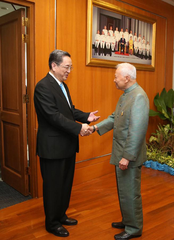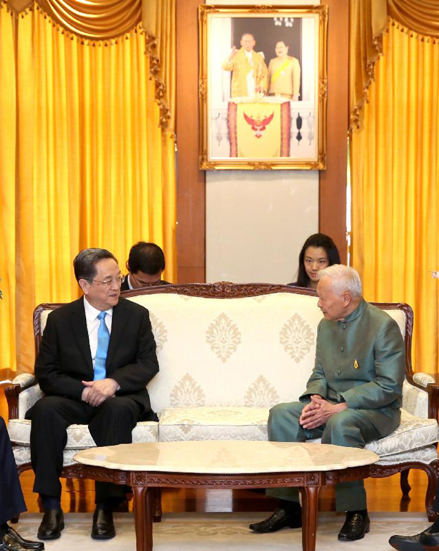 应泰国立法议会主席蓬贝邀请,全国政协主席俞正声7月21日至24日对泰国进行正式友好访问,在曼谷分别会见国王御代表诗琳通公主、总理巴育、枢密院主席炳,并与立法会主席蓬贝举行会谈。这是7月22日,俞正声会见枢密院主席炳。新华社记者马占成摄