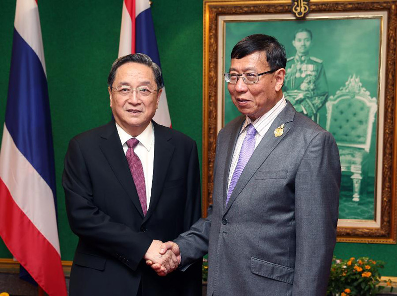 应泰国立法议会主席蓬贝邀请,全国政协主席俞正声7月21日至24日对泰国进行正式友好访问,在曼谷分别会见国王御代表诗琳通公主、总理巴育、枢密院主席炳,并与立法会主席蓬贝举行会谈。这是7月21日,俞正声与泰国立法议会主席蓬贝举行会谈。新华社记者姚大伟摄