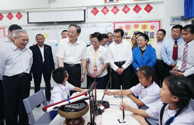 应泰国立法议会主席蓬贝邀请,全国政协主席俞正声7月21日至24日对泰国进行正式友好访问,在曼谷分别会见国王御代表诗琳通公主、总理巴育、枢密院主席炳,并与立法会主席蓬贝举行会谈。这是7月24日,俞正声在泰国清迈考察崇华新生华立学校。新华社记者姚大伟摄