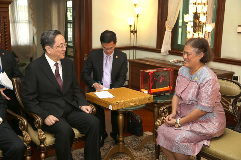 应泰国立法议会主席蓬贝邀请,全国政协主席俞正声7月21日至24日对泰国进行正式友好访问,在曼谷分别会见国王御代表诗琳通公主、总理巴育、枢密院主席炳,并与立法会主席蓬贝举行会谈。这是7月23日,俞正声会见国王御代表诗琳通公主。新华社记者马占成摄