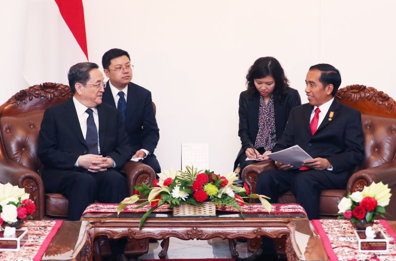 7月27日,中国全国政协主席俞正声在雅加达会见印尼总统佐科。新华社记者 姚大伟 摄 在会见佐科时,俞正声祝贺印尼在佐科总统领导下经济社会发展取得的新成就,表示中国与印尼关系正处于历史最好时期,习近平主席与佐科总统已多次会晤,就深化两国全面战略伙伴关系达成重要共识,为对接建设“21世纪海上丝绸之路”构想和“全球海洋支点”规划、为双边关系不断发展指明了方向。中国和印尼发展前景远大,合作天地广阔。中方愿同印尼方积极努力,切实落实两国领导人共识,进一步深化战略互信,扩大交通基础设施、产能、投资、贸易等领域务实合作,增进科技、文化、旅游等方面人文交流,推动中国与印尼关系取得更大发展。 佐科表示,他与习近平主席就深化两国全面战略伙伴关系达成许多重要共识,印尼与中国在双边和国际地区事务中的合作取得新成果。印尼方高度重视对华关系,愿与中方深入对接两国发展战略,推进基础设施建设、经贸、制造业、人文、旅游等领域合作,造福两国人民。