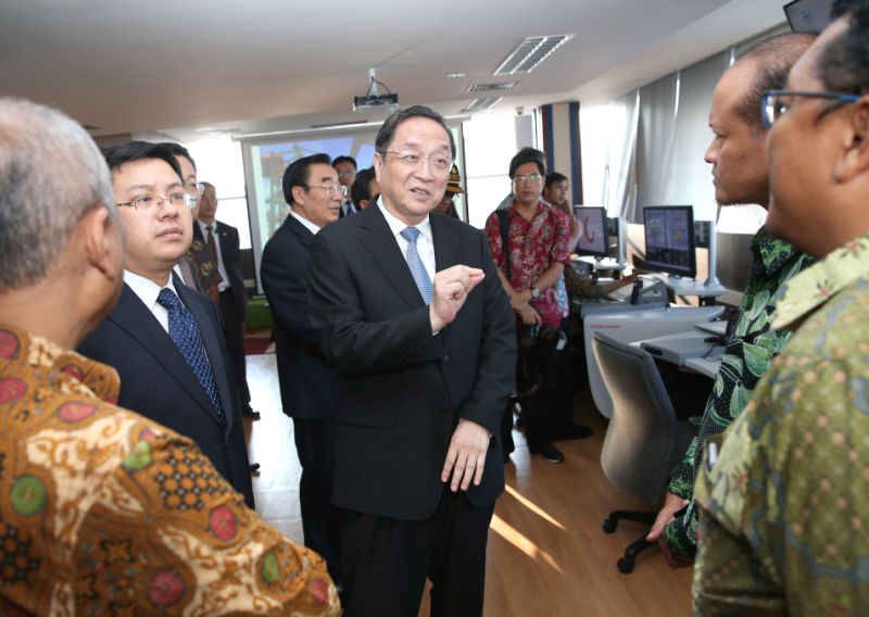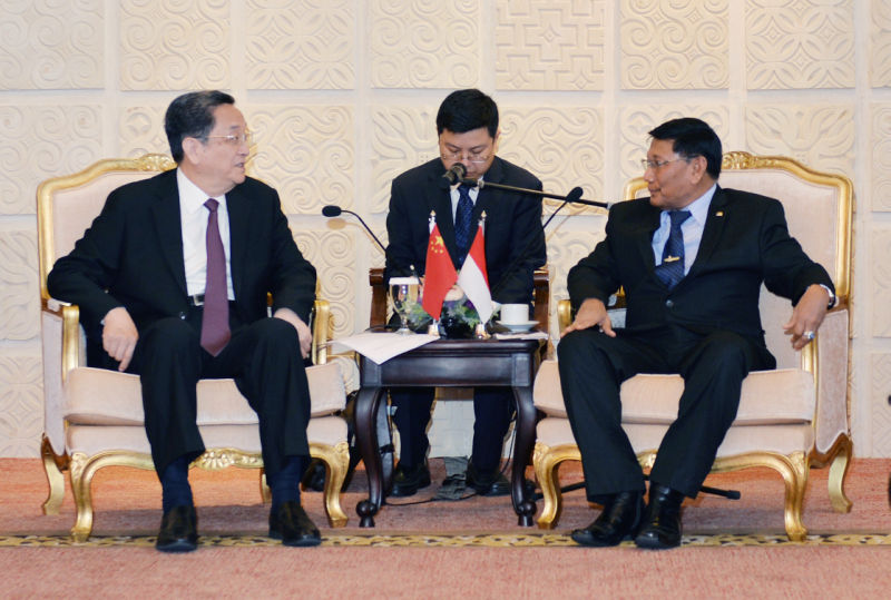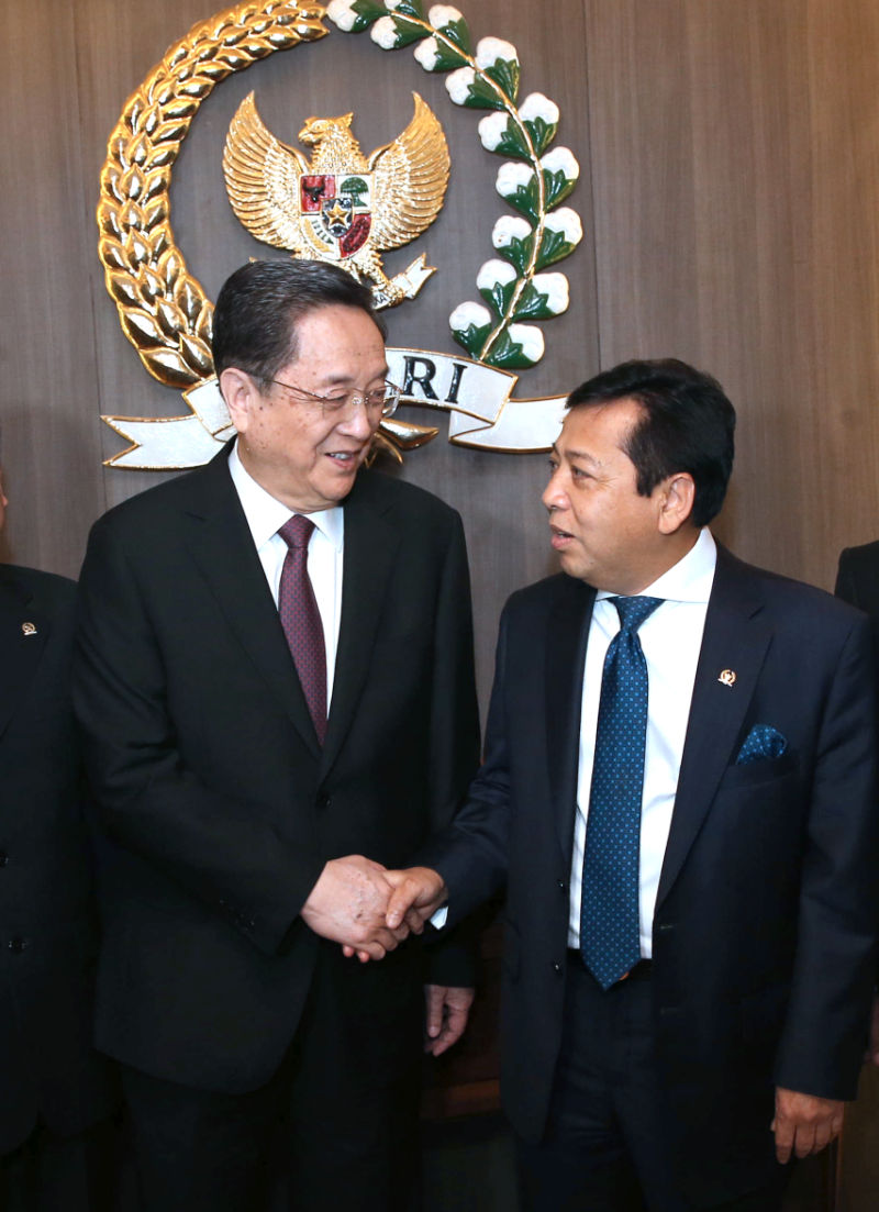 7月27日,中国全国政协主席俞正声在雅加达会见印尼国会议长诺凡托。新华社记者 马占成 摄 在会见诺凡托时,俞正声表示,中国致力于与各国实现和平发展、共同发展。中国与印尼互为发展机遇,两国应增进了解,加强合作,实现互利共赢。 诺凡托表示,印尼与中国关系具有高度战略性。印尼方赞赏中方倡导建设“一带一路”和建立亚投行,愿积极参与,进一步推进两国关系发展。