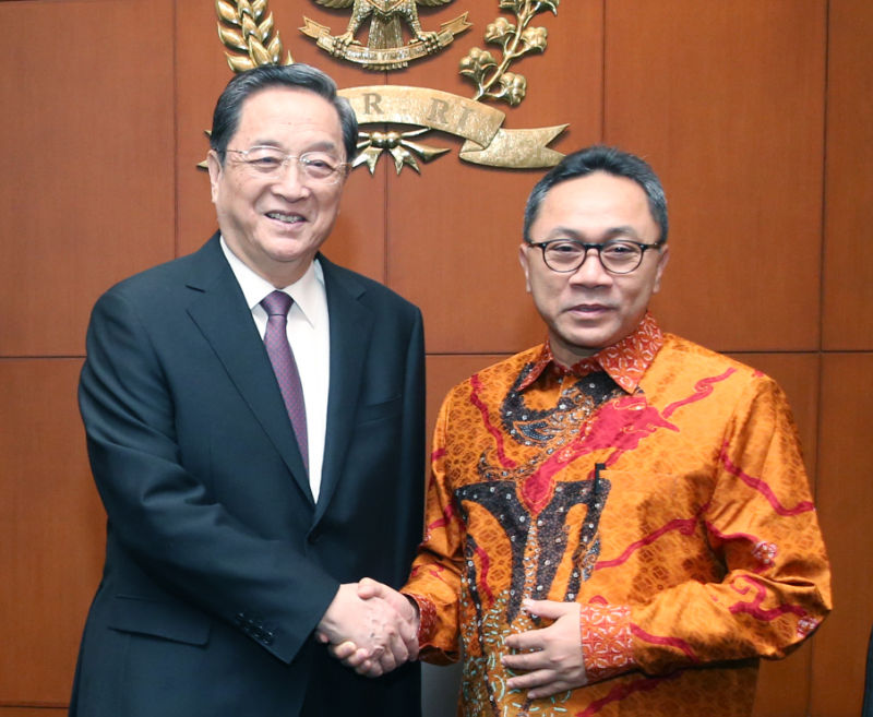 7月27日,中国全国政协主席俞正声在雅加达会见印尼人民协商会议主席祖尔基弗利。新华社记者 姚大伟 摄 在会见祖尔基弗利时,俞正声表示,中国和印尼是友好邻邦,中国愿在印尼发展振兴的道路上与印尼携手同行。俞正声介绍了中国全国政协在国家政治制度中发挥的重要作用,表示全国政协愿与印尼人民协商会议加强交流互鉴,共同推动两国发展,深化人民友谊。 祖尔基弗利表示,印尼与中国各领域合作交流不断深入,两国关系日益紧密。中国是世界上的重要国家,在国际事务中发挥着越来越重要的作用。印尼人民协商会议愿与中国全国政协共同促进两国友好合作。