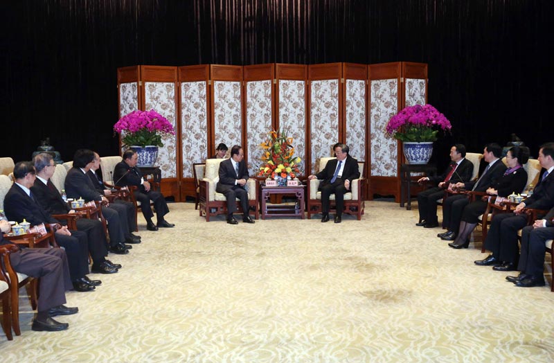10月23日,全国政协主席俞正声在北京钓鱼台国宾馆会见来华参加第十一届北京-东京论坛的日本前首相福田康夫及其率领的日方代表团。新华社记者 刘卫兵 摄 在会见日本客人时,俞正声说,中国经济经过30年高速发展形成的巨大市场,对日本企业是一个机遇;日本企业的先进技术,值得中国企业借鉴学习。中日经济合作对双方都是有利的,而深化双方的经济合作要以两国间的政治互信为基础。他还高度肯定了福田康夫等日本朋友对办好本届论坛、推动中日交流所做的贡献,并预祝本届论坛圆满成功。 福田康夫说,日中双方希望通过论坛在各层面进行充分交流,寻求双方的共同利益。他表示,论坛要为改善日中两国关系继续努力。 |