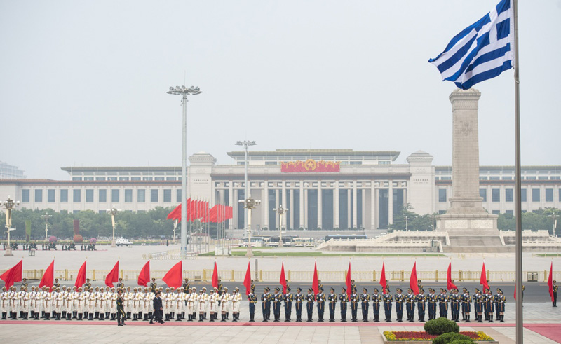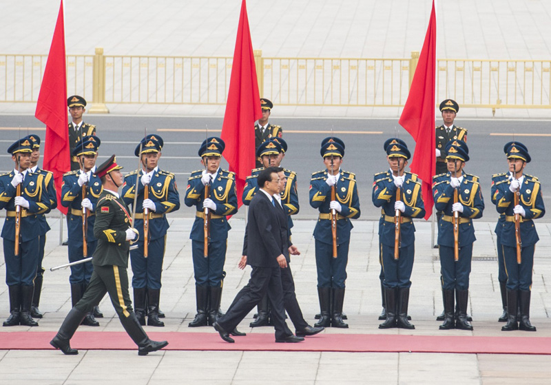 这是会谈前,李克强在人民大会堂东门外广场为齐普拉斯举行欢迎仪式。新华社记者 李涛 摄