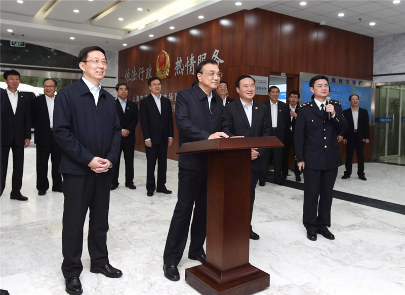 11月21日至22日,中共中央政治局常委、国务院总理李克强来到上海自由贸易试验区,实地考察自贸区建设取得的新进展。这是11月21日,在浦东新区市场监管局,李克强通过“双随机一公开”系统现场下达食品安全抽查指令,对如何随机抽取检查对象和检查人员进行检验。新华社记者 饶爱民 摄