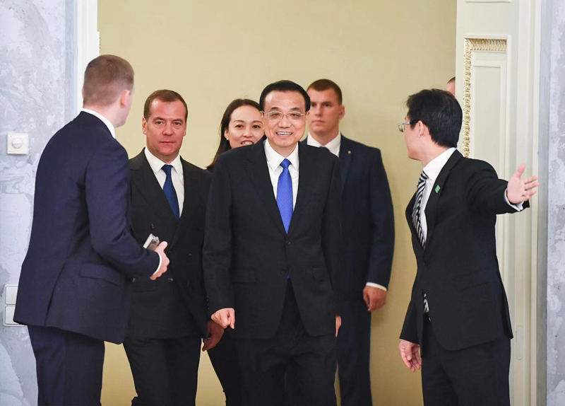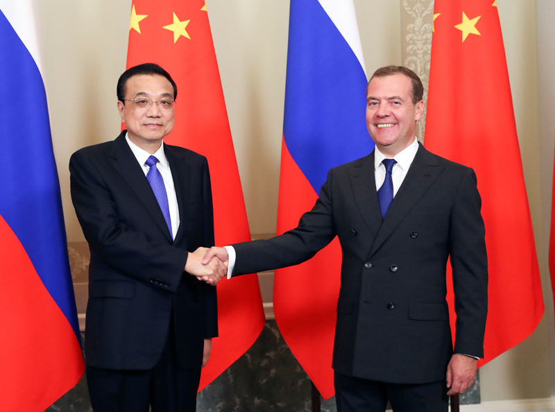 李克强表示,中俄互为最大邻邦,同为联合国安理会常任理事国。今年是中俄建交70周年。双方本着相互尊重、平等相待、互利共赢的原则,推动两国关系稳步前行,健康发展。前不久,习近平主席成功访俄,两国关系提升为新时代全面战略协作伙伴关系。在国际政治经济形势不确定不稳定因素增多的背景下,中俄加强战略协作,增进政治互信,拓展务实合作,密切人文交流,不仅有利于双方,也对维护地区乃至世界的繁荣稳定释放出积极信号。