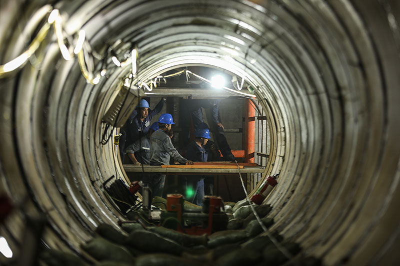 南方电网公司项目人员在粤澳联网220千伏第三通道电缆管廊内进行施工作业(2019年5月13日摄)。新华社发(杨惠平 摄)