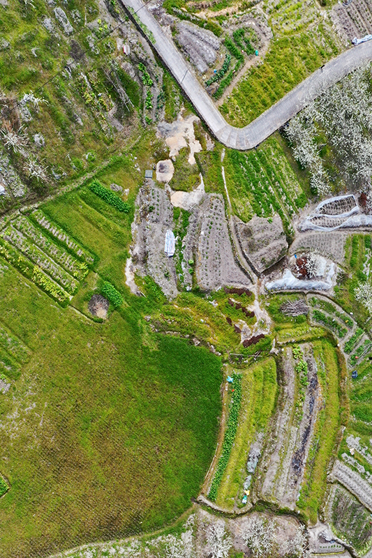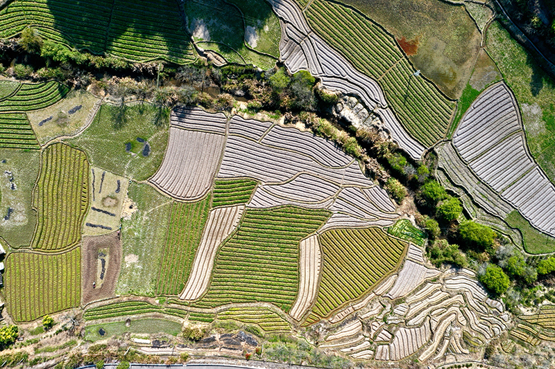 春耕时节,在福建省福州市乡村山岭间,一块块形状各异、五彩斑斓的田地犹如大地上的拼图,呈现别样的春耕画卷。