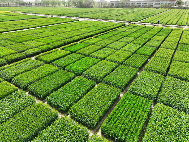 4月12日,农民在江苏里下河地区农科所(扬州市农科院)麦田查看情况(无人机照片)。