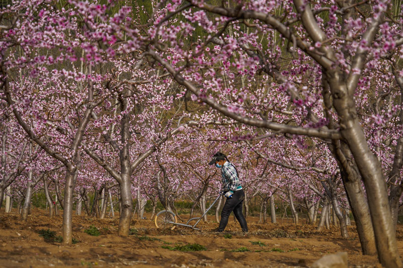 4月12日,河北省遵化市东旧寨镇五虎岭村农民在桃树果园劳作。