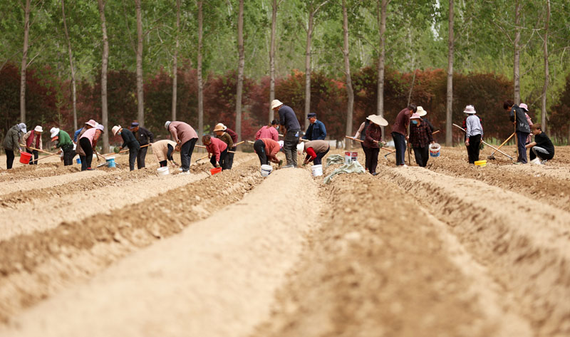 4月12日,农民在山东省临沂市郯城县港口社区中药材种植基地种植丹参。