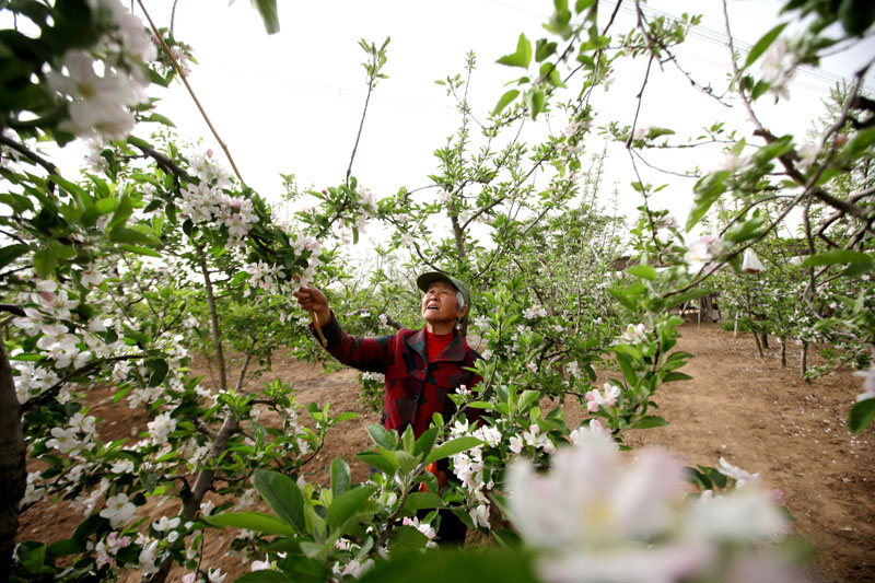 4月12日,山东省临沂市平邑县地方镇农民为苹果花授粉。