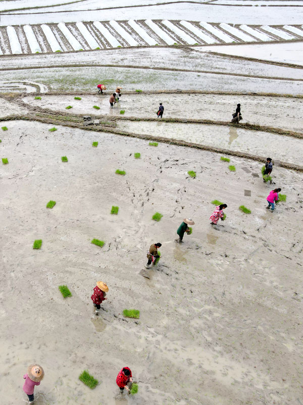 4月12日,农民在湖南省娄底市双峰县井字镇花桥村的田间抛秧(无人机照片)。