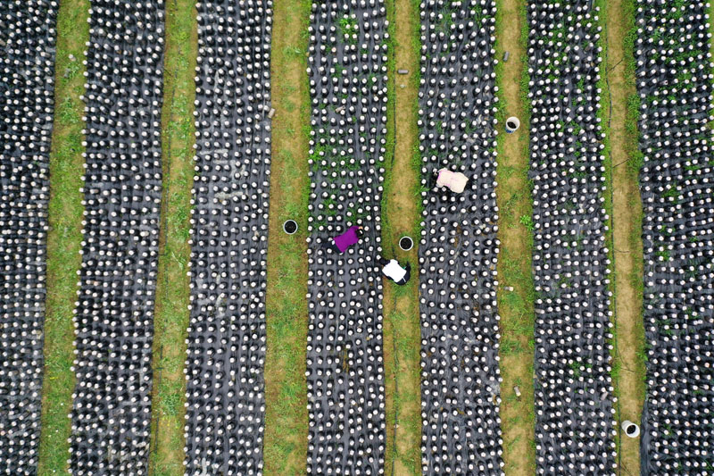4月12日,村民在重庆市黔江区石会镇一处食用菌种植基地管理即将采收的黑木耳(无人机照片)。