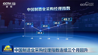 8月份中国制造业采购经理指数为49.7%,较上月上升0.4个百分点,连续3个月回升。在调查的21个行业中,有12个行业采购经理指数环比回升,制造业景气水平进一步改善。