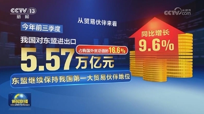 从贸易伙伴来看,今年前三季度,我国对共建“一带一路”国家进出口17.37万亿元,同比增长6.2%;对东盟进出口5.57万亿元,同比增长9.6%,占我国外贸总值的16.6%,东盟继续保持我国第一大贸易伙伴地位。
