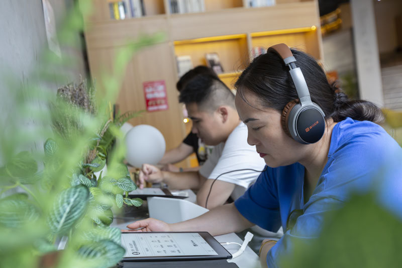 5月16日,在南昌市孺子书房·东湖意库馆,读者利用听书机体验在线阅读。