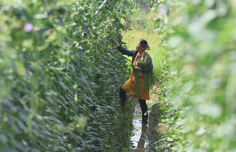 6月15日,在鹿寨县中渡镇石墨村,村民在高标准农田里采收豆角。