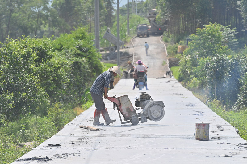 6月15日,在鹿寨县中渡镇石墨村,工人在建设田间道路。
