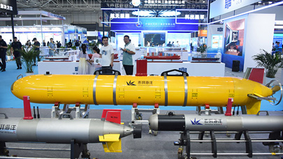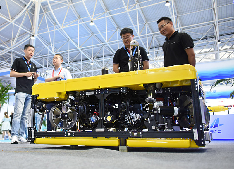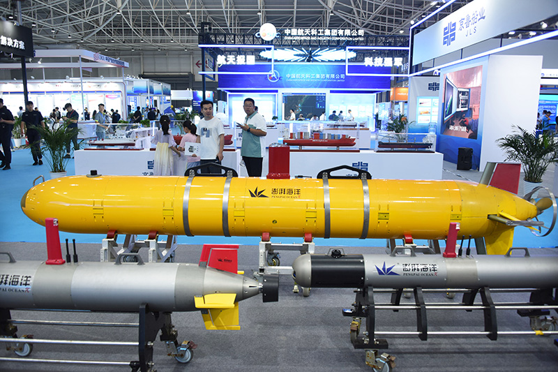 6月28日,参会者在展会上参观“水下滑翔机”。