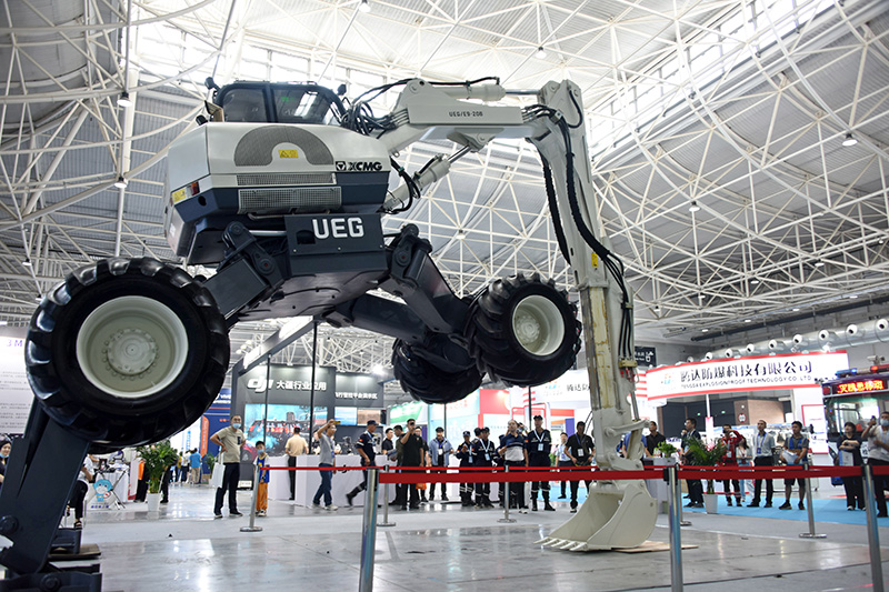 6月28日,参会者在展会上观看挖掘机特技演示。